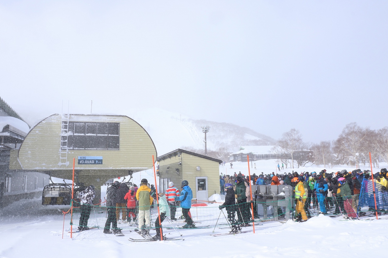 キング第3リフトは中腹部の多くの斜面をカバーするため,ニセコの中でも人気が高く,4人乗りリフトの輸送能力では下の写真のように混雑が常態化していました。