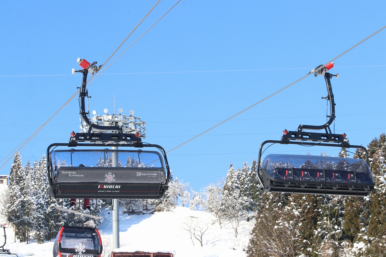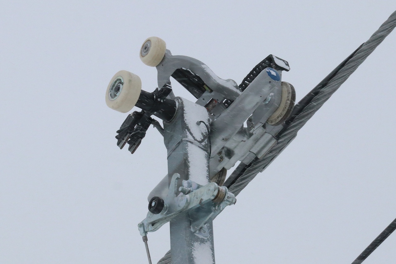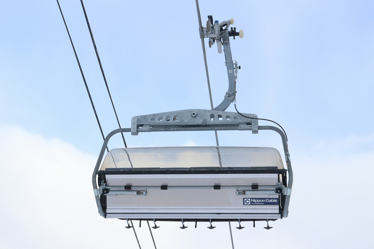 搬器は,ヒータ付きのためお尻がぽかぽかです。ヒータ電源は握索機の集電端子から搬器下のヒータ電源供給されているようです。また,搬器モデルも最新モデルのD-LINEではなく一世代前のモデルのようです。