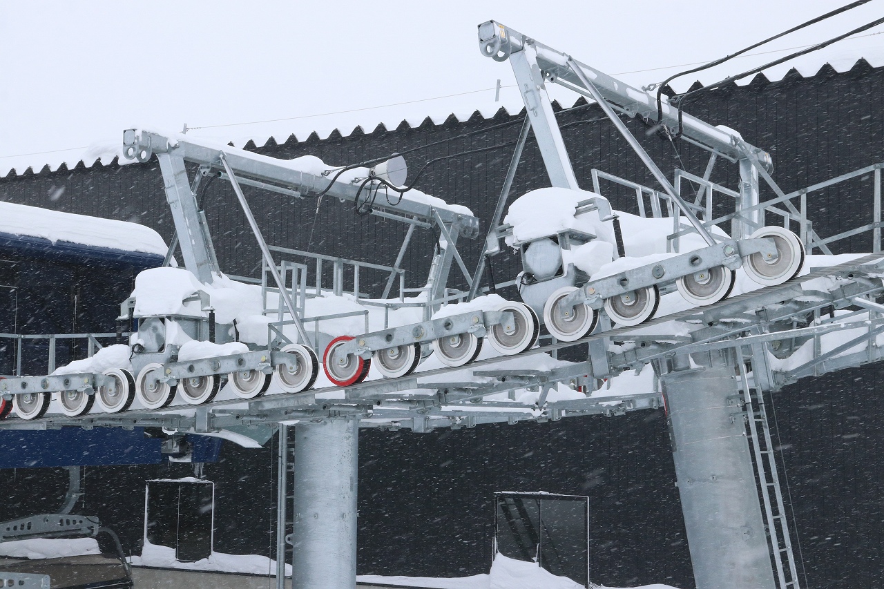 他の索輪より重い所謂「赤玉」ですが,近年は石打丸山のサンライズエクスプレスなど赤玉表示がないものが増えている印象ですが,架け替え後のキング第3リフトは一目でわかりやすくなっています。